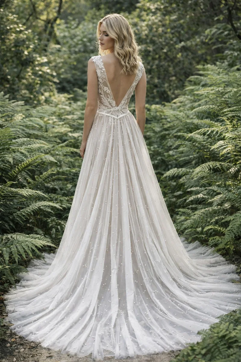 The waist is delicately cinched by a double satin ribbon belt that flatters and defines the silhouette, flowing into a full tulle skirt scattered with hand-applied pearls. These luminous accents shimmer as you move, catching the light like dewdrops at dawn. The skirt’s airy, layered construction creates soft volume and movement without weighing you down, perfect for gliding down the aisle or dancing the night away. The chapel-length train adds a dreamy, romantic finish — effortlessly glamorous for both grand ceremonies and intimate celebrations.