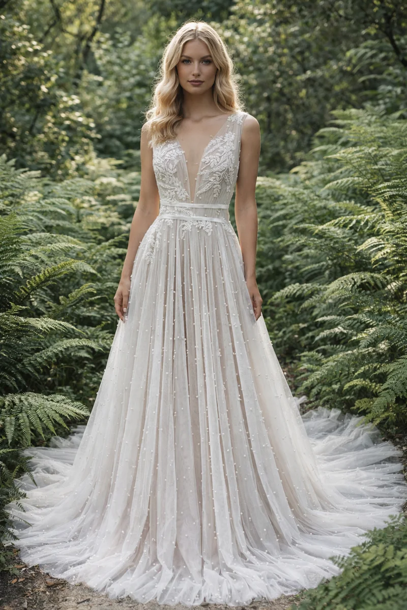 Make an unforgettable entrance in this ethereal aline wedding gown with lace appliques along the bodice, tulle skirt and scattered pearls designed for the modern romantic who dreams of whimsical elegance. This wedding dress captures timeless beauty with its airy silhouette, delicate embroidery, and graceful plunging v-neckline — a perfect harmony of contemporary femininity and fairy-tale charm.
