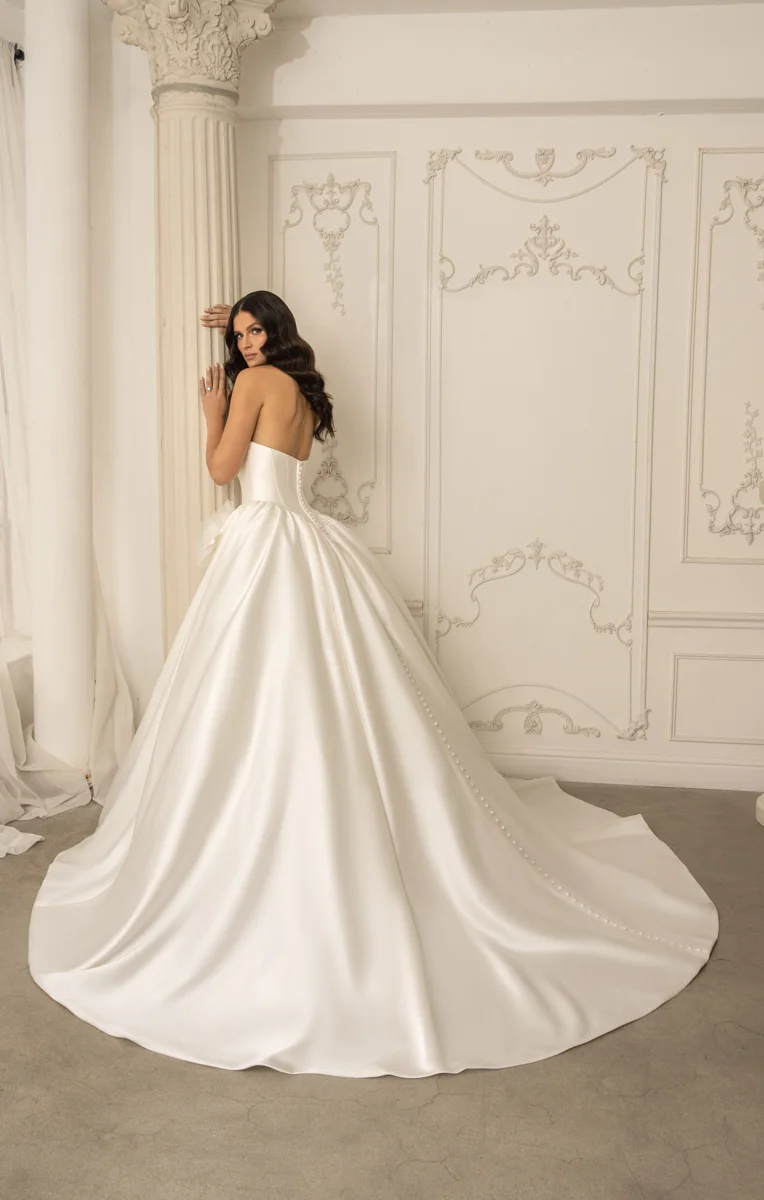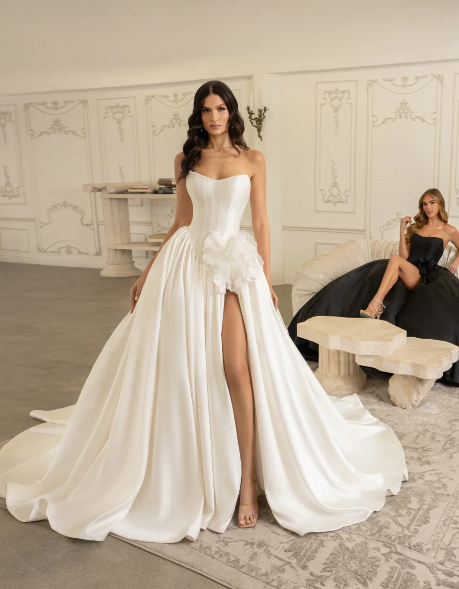 Whether you’re walking down the aisle of a grand ballroom or saying “I do” beneath a canopy of stars, the satin ballgown delivers striking beauty from its strapless scoop neckline to its thigh-high slit. It’s the ideal choice for the fashion-forward bride seeking a clean yet bold look that doesn’t compromise on sophistication or tradition.