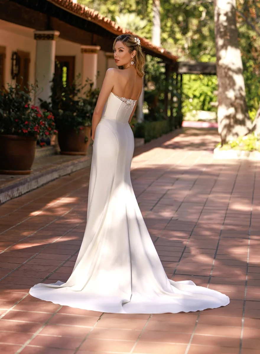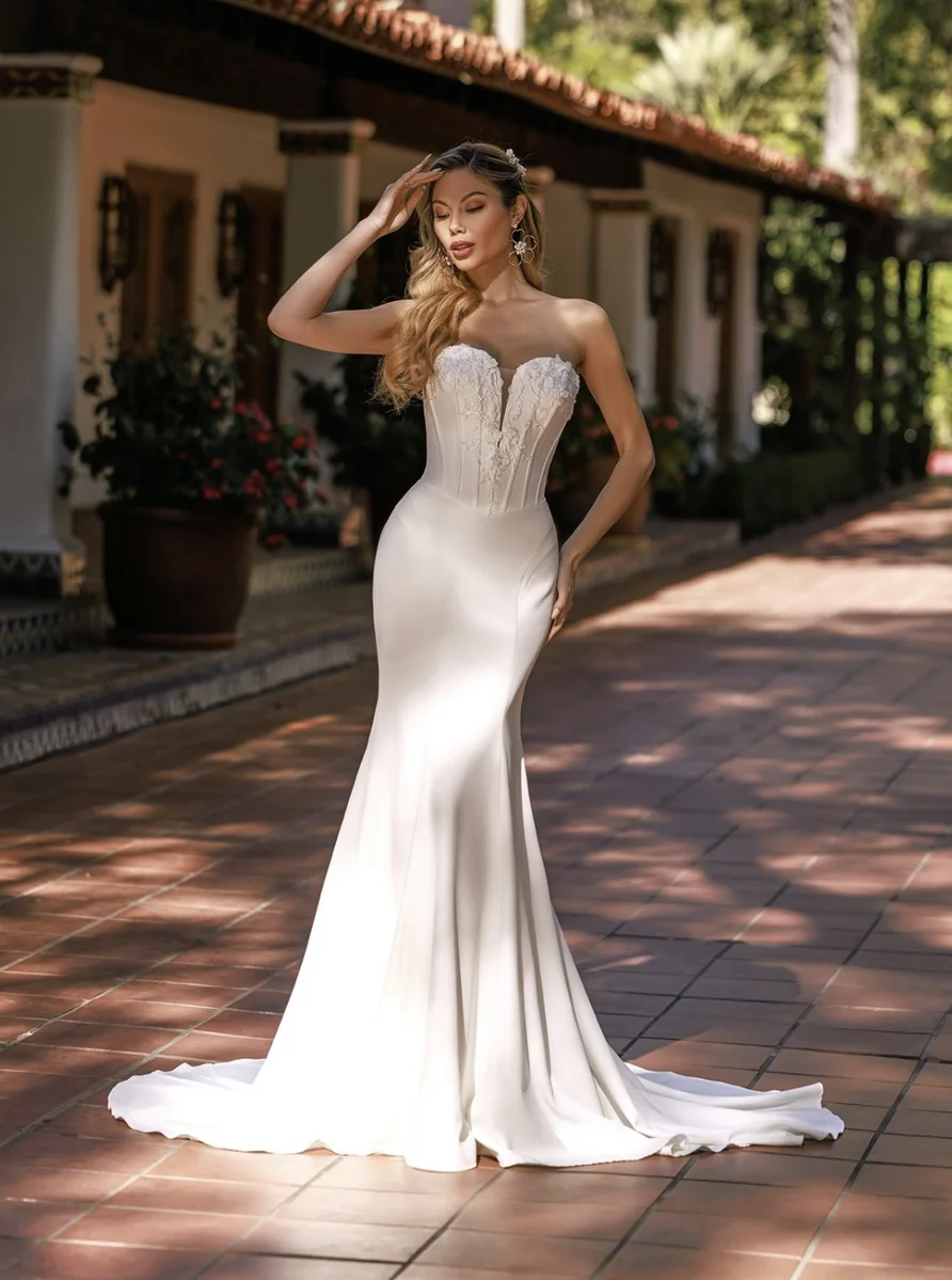 Set against a warm, Mediterranean-inspired backdrop, this dress feels perfectly suited for an outdoor estate wedding, a romantic garden celebration, or a chic destination ceremony. It is ideal for the bride who desires refined minimalism with just the right hint of romance—structured plunging corset strapless sweetheart bodice with lace appliques placed effortlessly over soft crepe.