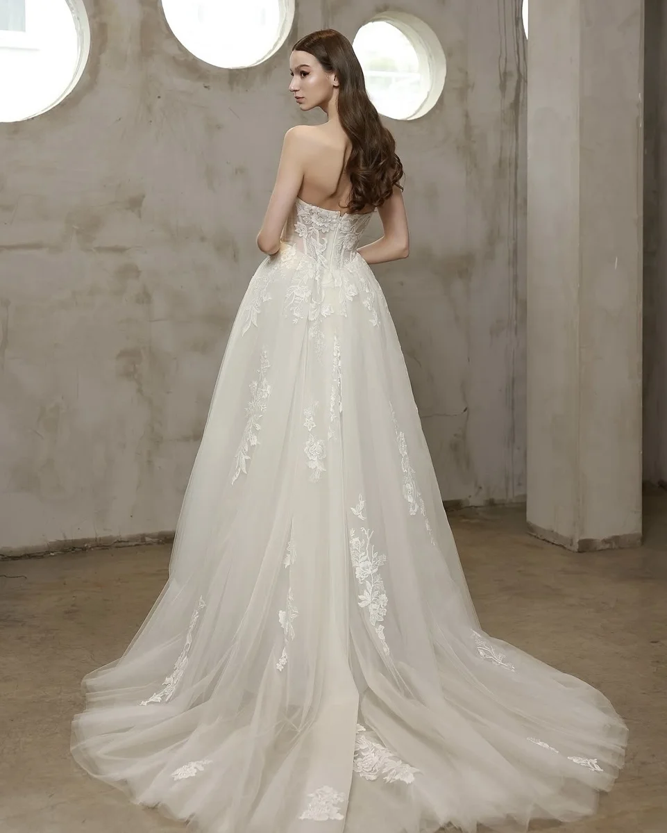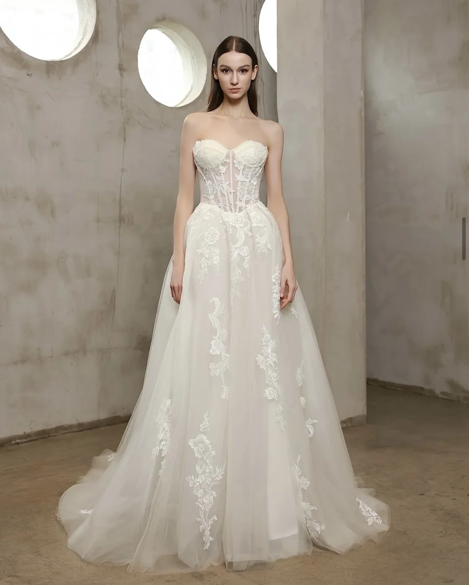 This strapless a-line gown is a vision of ethereal romance, combining delicate lace detailing with a light, airy tulle that feels both regal and effortlessly modern. Designed in a soft ivory hue with subtle champagne undertones, the dress radiates warmth and dimension, allowing the intricate lace appliqués to stand out beautifully against the sheer layers beneath. It is a refined yet whimsical a-line, ideal for the bride who dreams of a romantic statement with graceful movement.