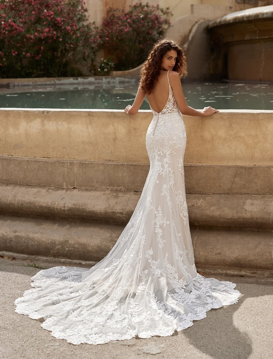 From the back, the gown reveals a dramatic low V-back that adds an alluring yet elegant touch. The open back contrasts beautifully with the detailed lace, striking a perfect harmony between sophistication and sensuality. The train extends gracefully behind, adorned with lace motifs that become more concentrated along the hem, forming a romantic and textured finish as it pools softly on the ground.