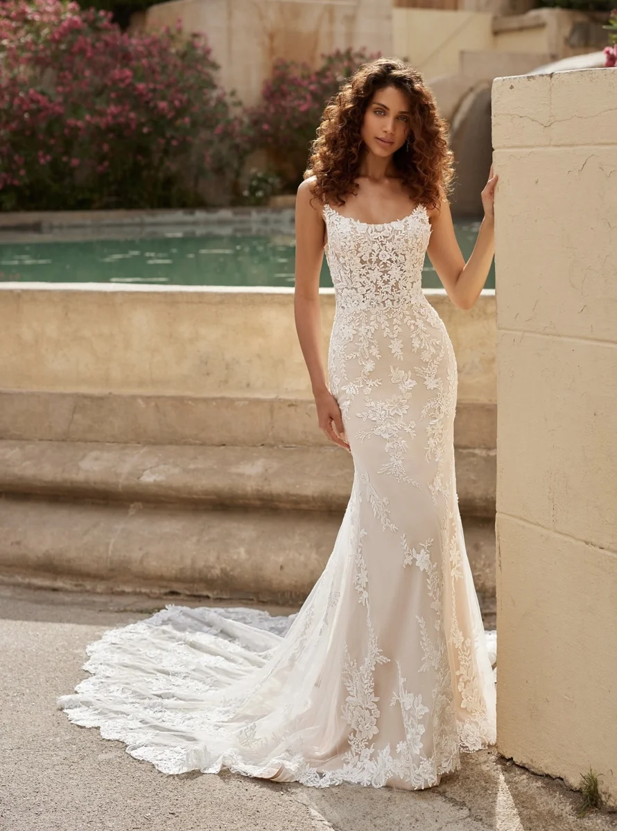 Set against a serene, sunlit courtyard, this gown feels perfectly suited for an outdoor celebration, a Mediterranean-inspired venue, or a romantic destination wedding. It is ideal for the bride who desires a sleek, figure-enhancing silhouette combined with intricate lace detail. With its sculpted fit, delicate straps, and breathtaking back, this dress captures the essence of modern bridal beauty—beaded lace appliques over sparkly glitter tulle.